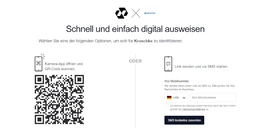 - Klicken Sie in der E-Mail, die Sie von Nect erhalten, auf den Button Jetzt starten. Diese leitet Sie auf die Verifizierungsseite weiter. Dort können Sie einen QR-Code scannen um die Verifikationsmethode auf dem Smartphone zu starten, oder sich einen Link per SMS zukommen lassen.