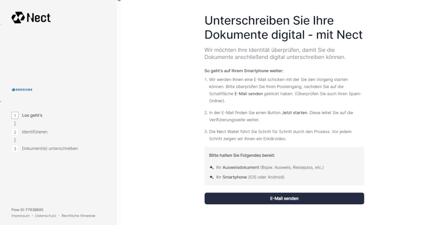 Nect bietet eine vollständig mobile Lösung zur Identifikation. Der Prozess wird über eine App durchgeführt und ist besonders einfach aufgebaut. Die Identitätsprüfung erfolgt automatisiert und ohne lange Wartezeiten. Anschließend können Sie Ihre Dokumente direkt digital signieren. Haben Sie sich in der Wallet einmal identifiziert, können Sie diese Verifikation anschließend führ mehrere Signaturen verwenden.
